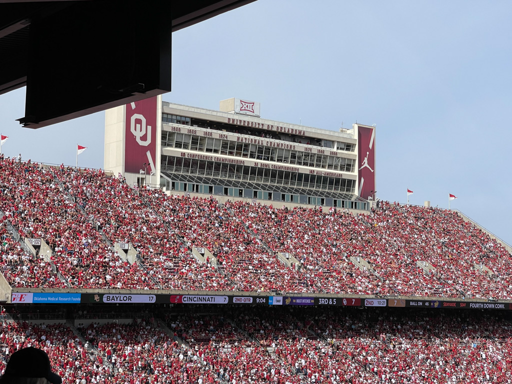 October 21, 2023 Oklahoma Versus Univ Central Florida – 31 to 29 Beautiful day for a game From the seats Prior to the game Seven National Championships New endzone view Megan’s plaque on Scholars Walk on South Oval Related Posts Football season is finally here! 1968 Christmas & Vacation Edmond LibertyFest Car Show About The Author Ron Hulshizer